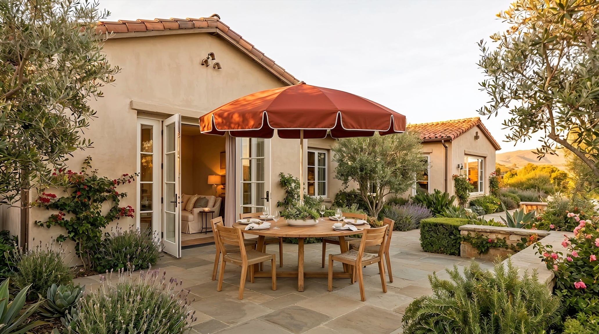 It creates a room. Without overhead definition, a patio dinner feels like eating in a parking lot. An umbrella draws a visual boundary. Everything under it becomes "the dining room."