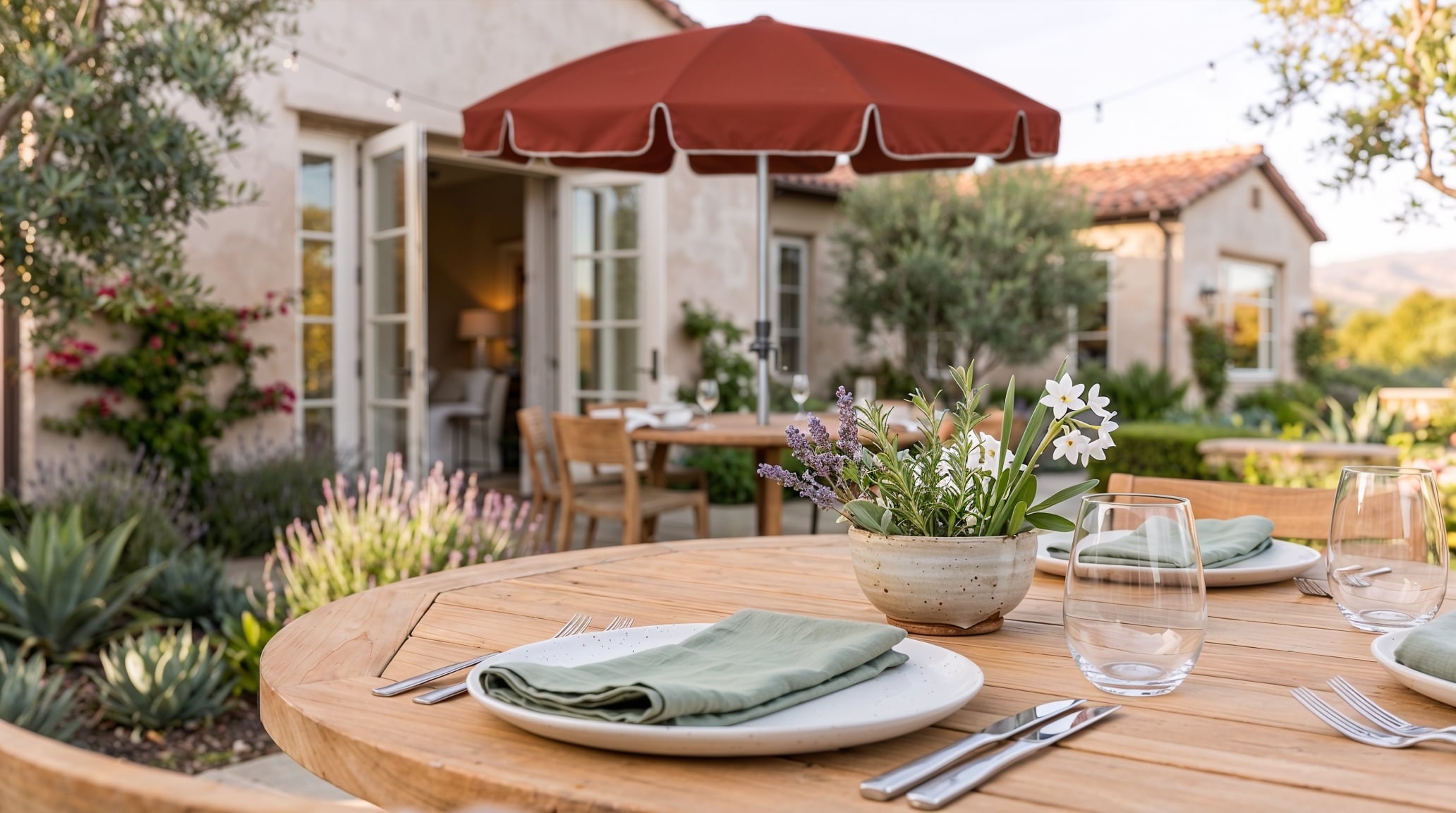 Setting a great outdoor dinner table comes down to four layers: shade first (a 9-foot canopy over a 4-person table), a simple base setting (real plates, cloth napkins, actual glasses), a low centerpiece that doesn't compete with the canopy, and ambient lighting that the umbrella reflects after dark.