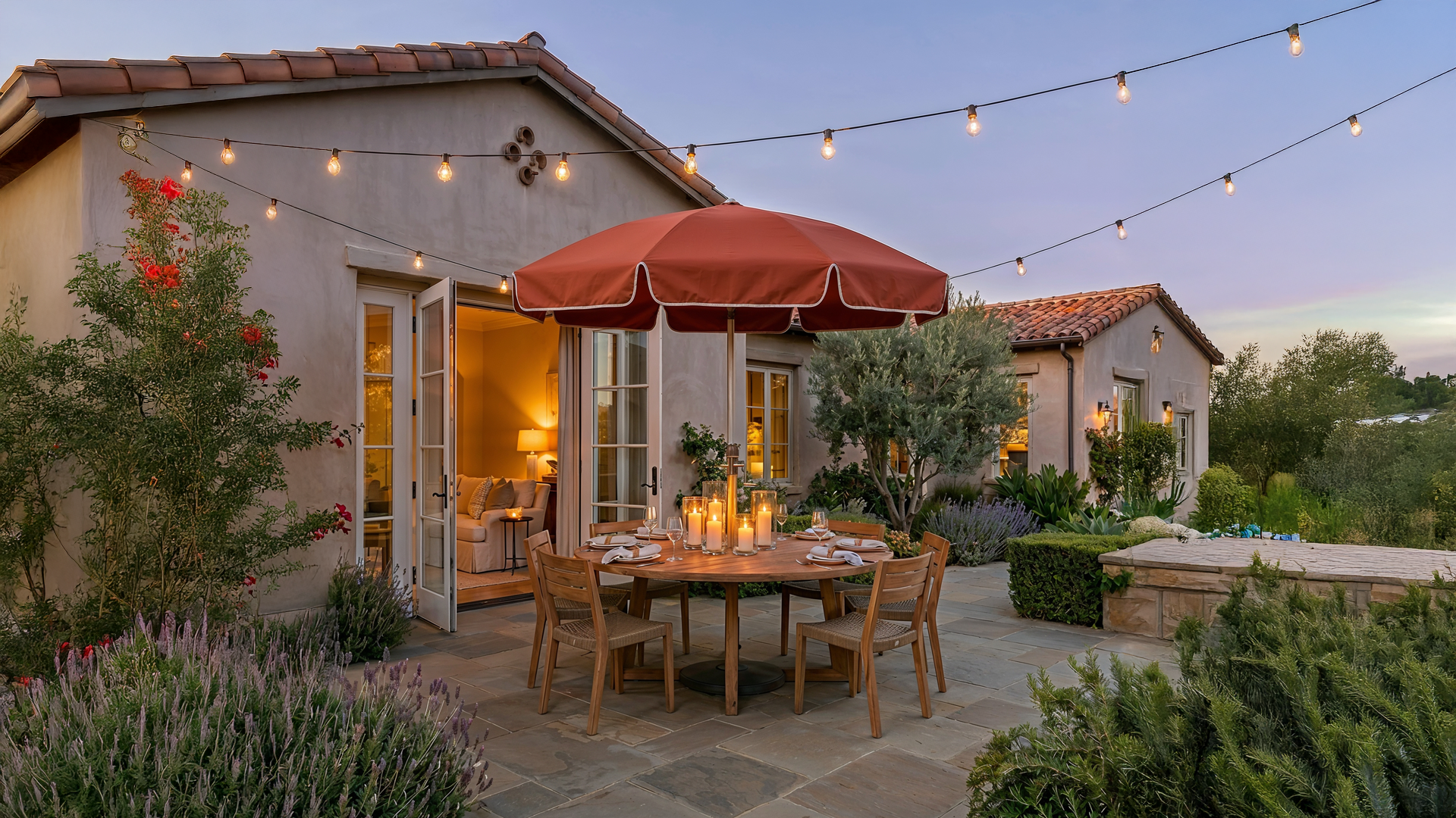 A patio umbrella over a dinner table does three things no centerpiece can:
