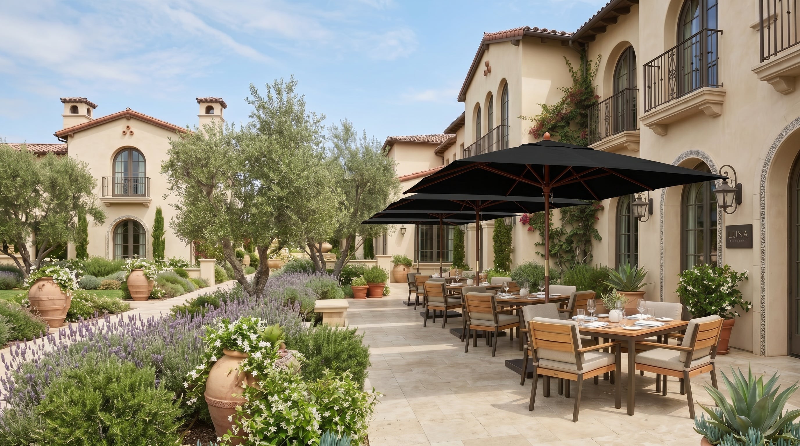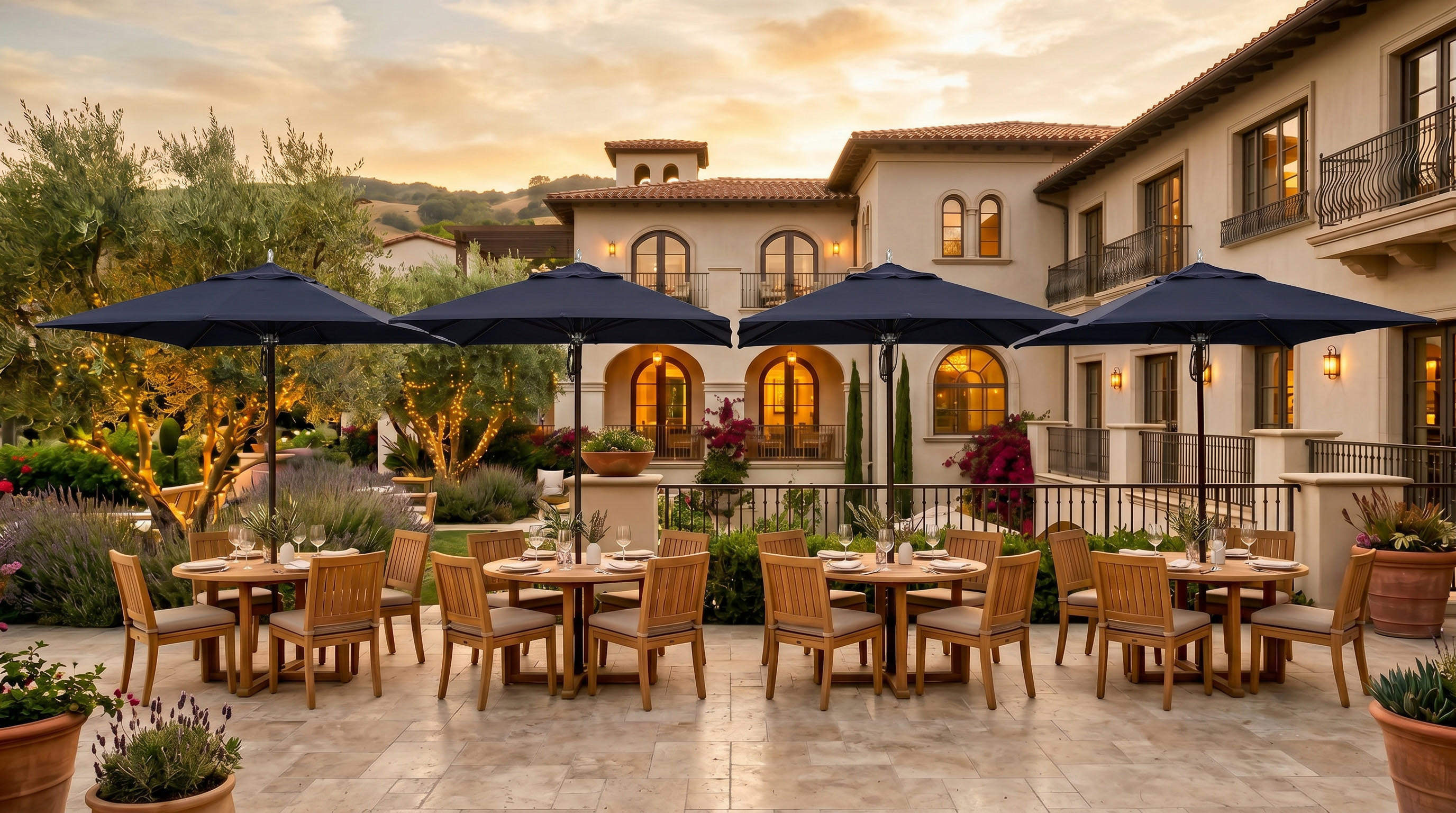 Restaurants (10–30 units): Market-style center pole umbrellas (Grove or Terrace) with matching cushions. Replacement canopy set for year-two refresh. Earth-tone or brand-matched Sunbrella colorway.
