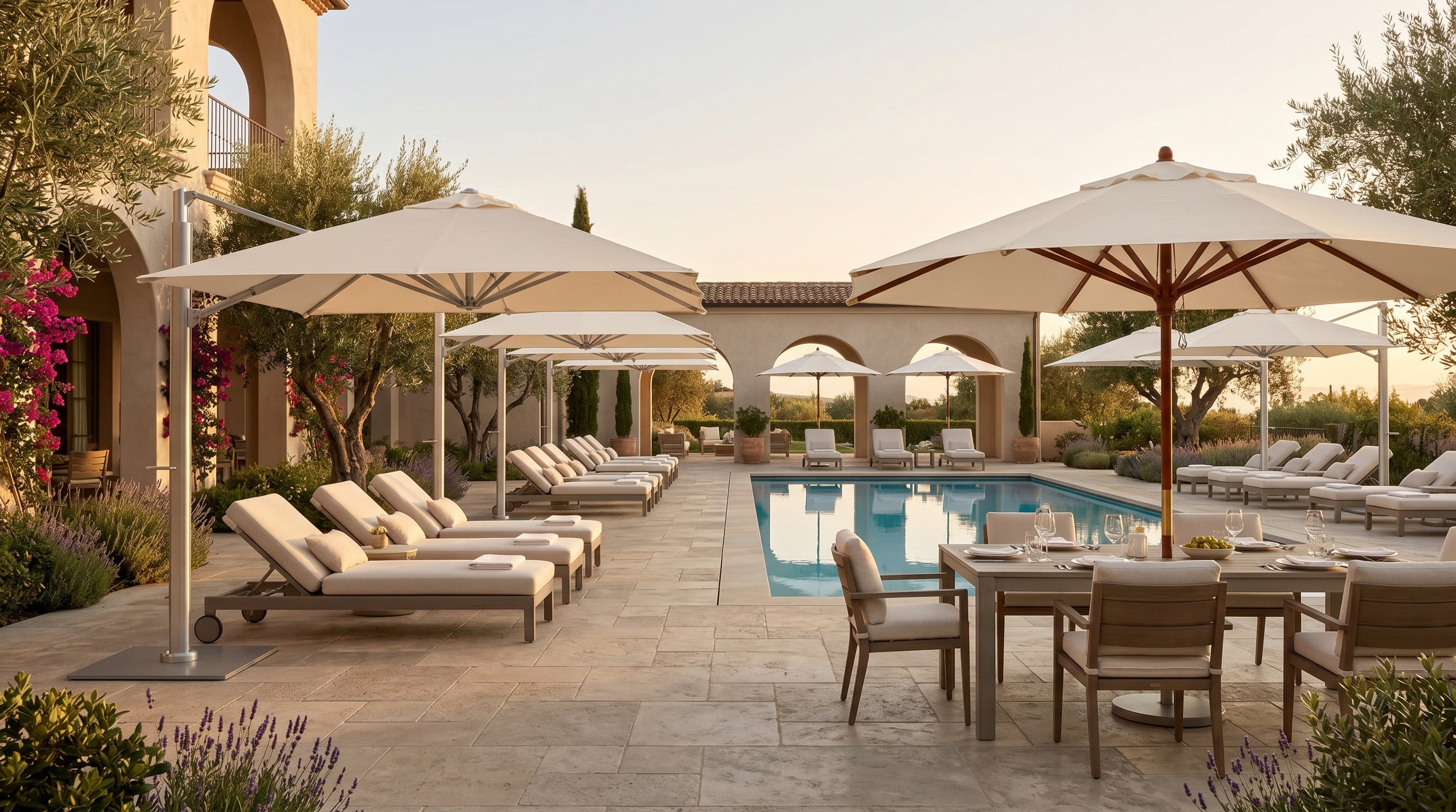 Hotels and resorts (30–100+ units): Mix of center pole (dining) and cantilever (pool decks) with full cushion packages. Custom colorway matching to brand standards. Annual replacement program.